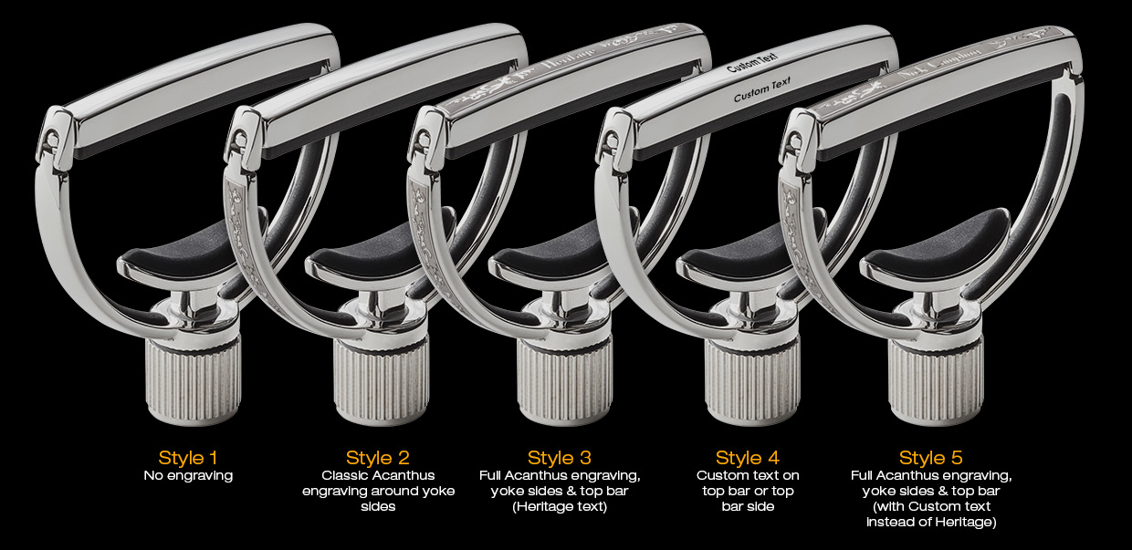 Available with several engraving options including custom text, and exquisite Acanthus Leaf designs on the curved sides and top bar of the capo.